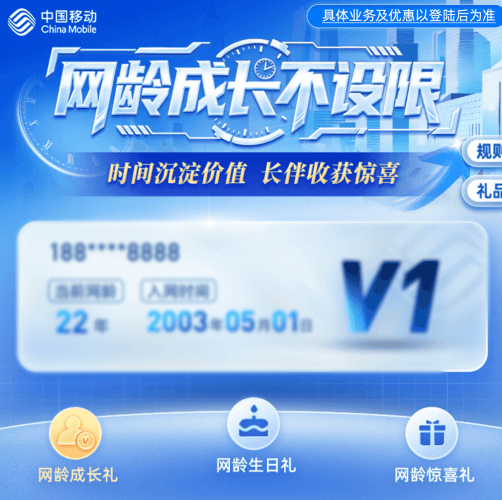 移动网龄送福利,网龄越长福利越大,有电视、音乐会、流量包等,每个月可抽