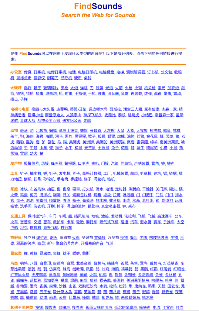 音效与乐器采样素材,有超过 100 万个音频片段,支持 AIFF、WAV、AU 格式,包含办公室、大破坏、动物、工具、交通、人体、自然、乐器、环境等类别,可在线预听、下载并导出音效,免费使用,无需注册。