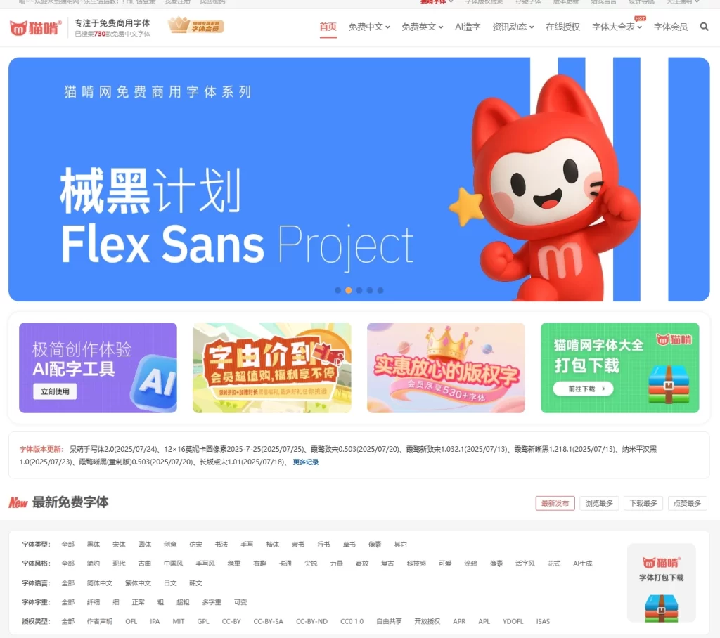 猫啃网 是一个专注于免费可商用字体收录与分享的网站,涵盖了海量的中文字体资源,每一款都经过合法授权整理,适用于商业项目、个人创作、平面设计等多种场景。页面分类清晰,支持字体预览与下载,设计师和内容创作者的必备工具
